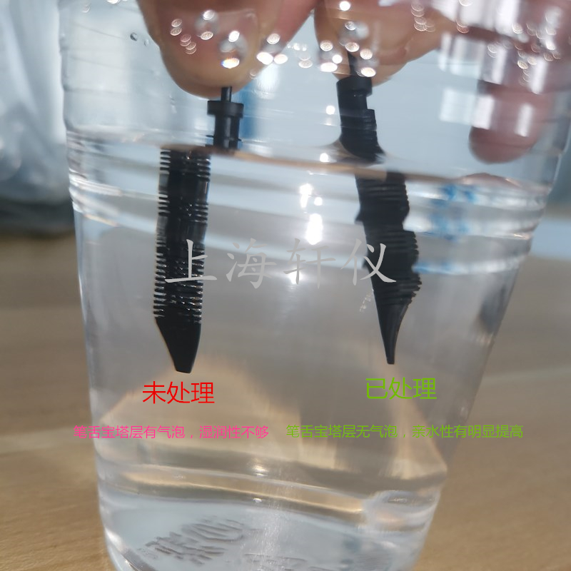 采用等離子體對筆舌表面處理,是通過氣體為介質(zhì)對筆舌表面進行清洗,可以改善材料表面潤濕性,具有處理操作簡單,容易控制,處理時間短,處理成本低,不需要化學試劑,不產(chǎn)生有害化學試劑的排放,減少了環(huán)境污染等優(yōu)點。